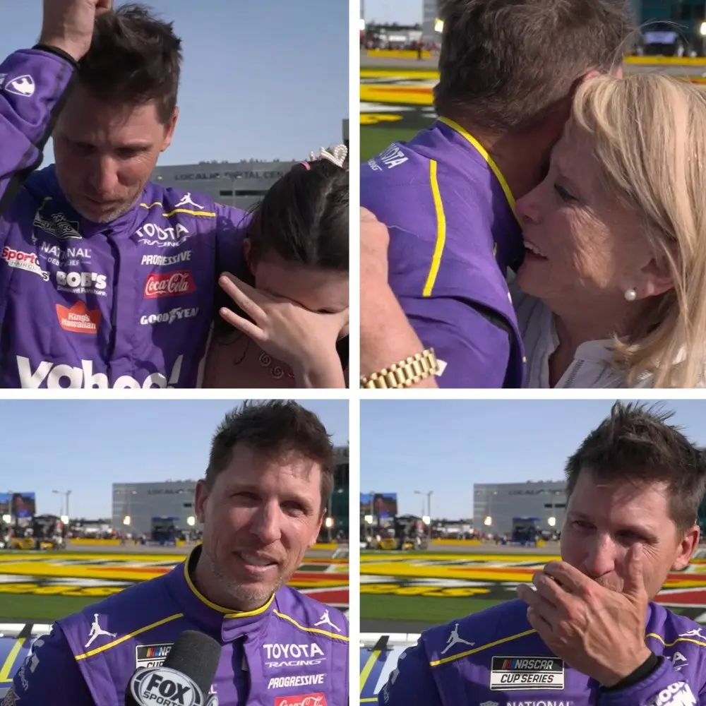 But what happened after the race quickly became the real story. As reporters gathered around Hamlin for the traditional interviews, the driver paused before speaking, his expression reflecting something deeper than the excitement of victory. Instead of focusing on tactics or competition, he began speaking about the people who had supported him long before he became a recognized name in professional racing. His words revealed a side of the champion that many fans rarely see.