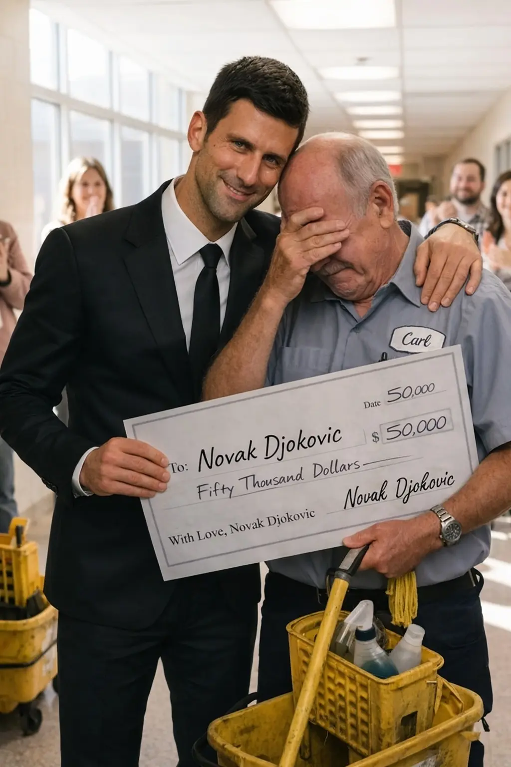 As Djokovic approached, the two men recognized each other instantly. What could have been a brief exchange of pleasantries turned into a genuine conversation. Djokovic, known for his intense focus on the court, sat down with Mr. Jenkins in a quiet corner of the school. He asked about the janitor’s life in detail—his health, his family, the daily struggles that kept him coming to work well past the typical retirement age. Mr. Jenkins opened up honestly, sharing how the income was still essential for covering medical expenses and supporting loved ones at home.