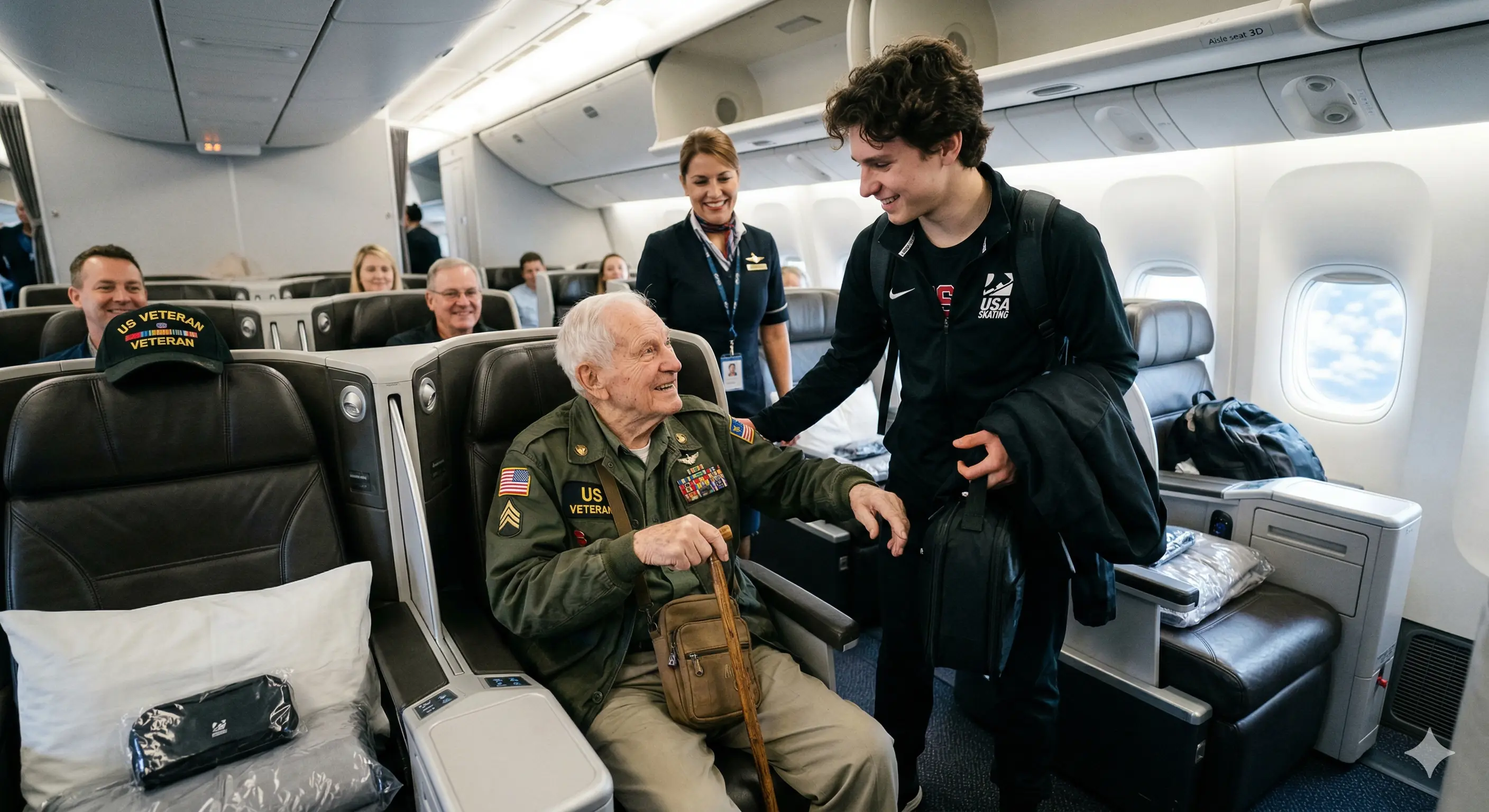 Eyewitnesses described the scene unfolding just minutes before the aircraft pushed back from the gate. Malinin, seated comfortably in first class, noticed an elderly man in military attire struggling to settle into a cramped economy seat several rows back. The veteran, later identified by passengers as a decorated U.S. service member in his late seventies, appeared weary from travel and carried the quiet dignity of someone who had served his country decades earlier. Without fanfare or announcement, Malinin stood up, approached the man, and offered his premium seat.