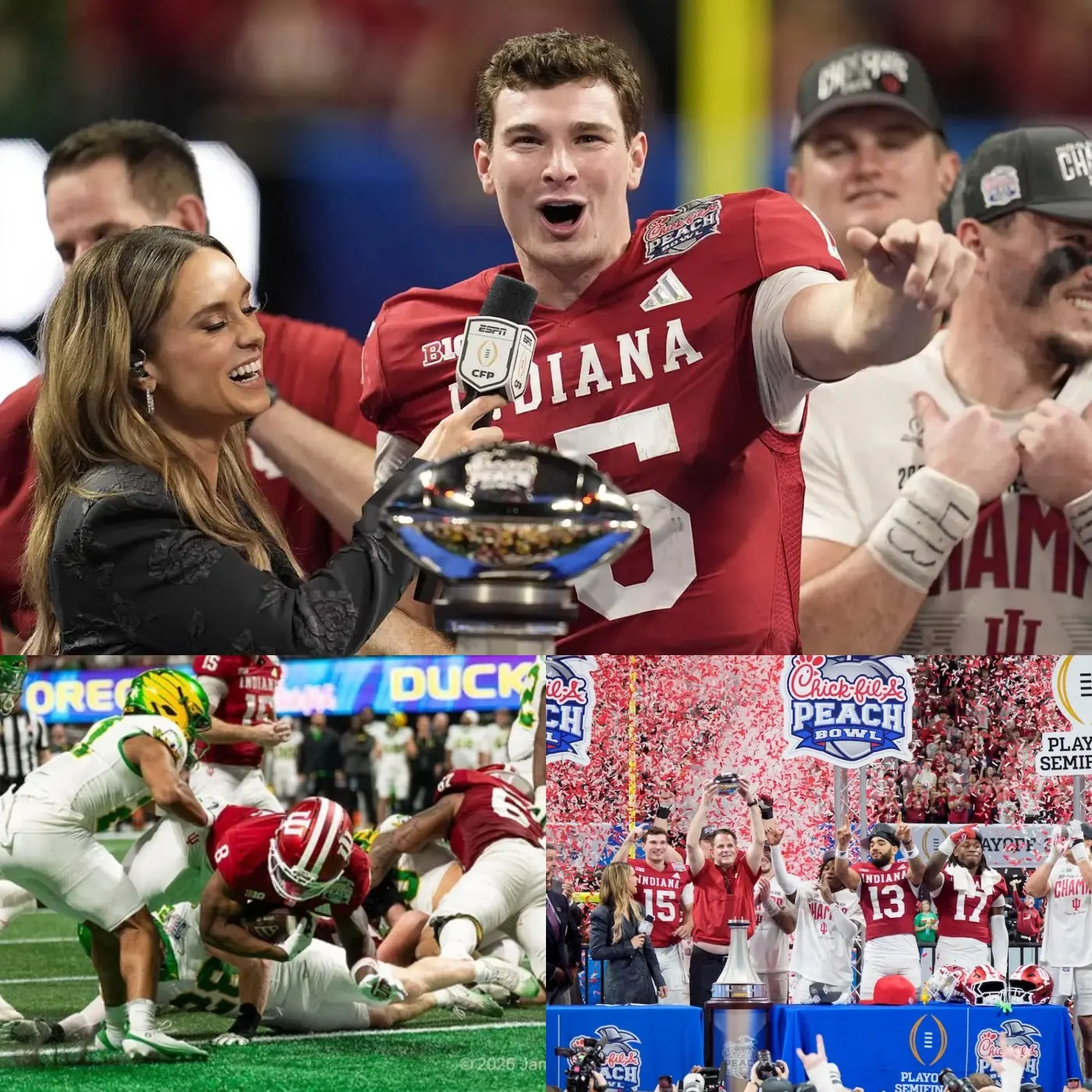 “Can you believe this is a truly perfect team?” The undefeated Indiana team shattered all doubts with a devastating 56-22 victory over Oregon in the Peach Bowl semifinals, officially securing their rightful number one seed in the playoffs. And now, they stand on the threshold of history: entering the list of the greatest teams of all time… if they fulfill their dream of winning the college football championship! 🔥🏈