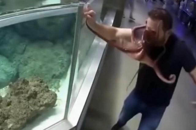 في حوض أسماك محلي، قضى رجل ما يقرب من نصف ساعة وهو يطرق على زجاج خزان الأخطبوط، مستفزًا الحيوان بعبارات مثل: “لماذا لا تتحرك؟ ظننت أنك ذكي جدًا!” استمر في الاستفزاز حتى نفد صبر الأخطبوط، فاندفع فجأة من الخزان وتشبث بوجه الرجل بمخالبه القوية. هرع موظفو الحوض لفصل الحيوان بعناية وإعادته بأمان إلى الماء.
