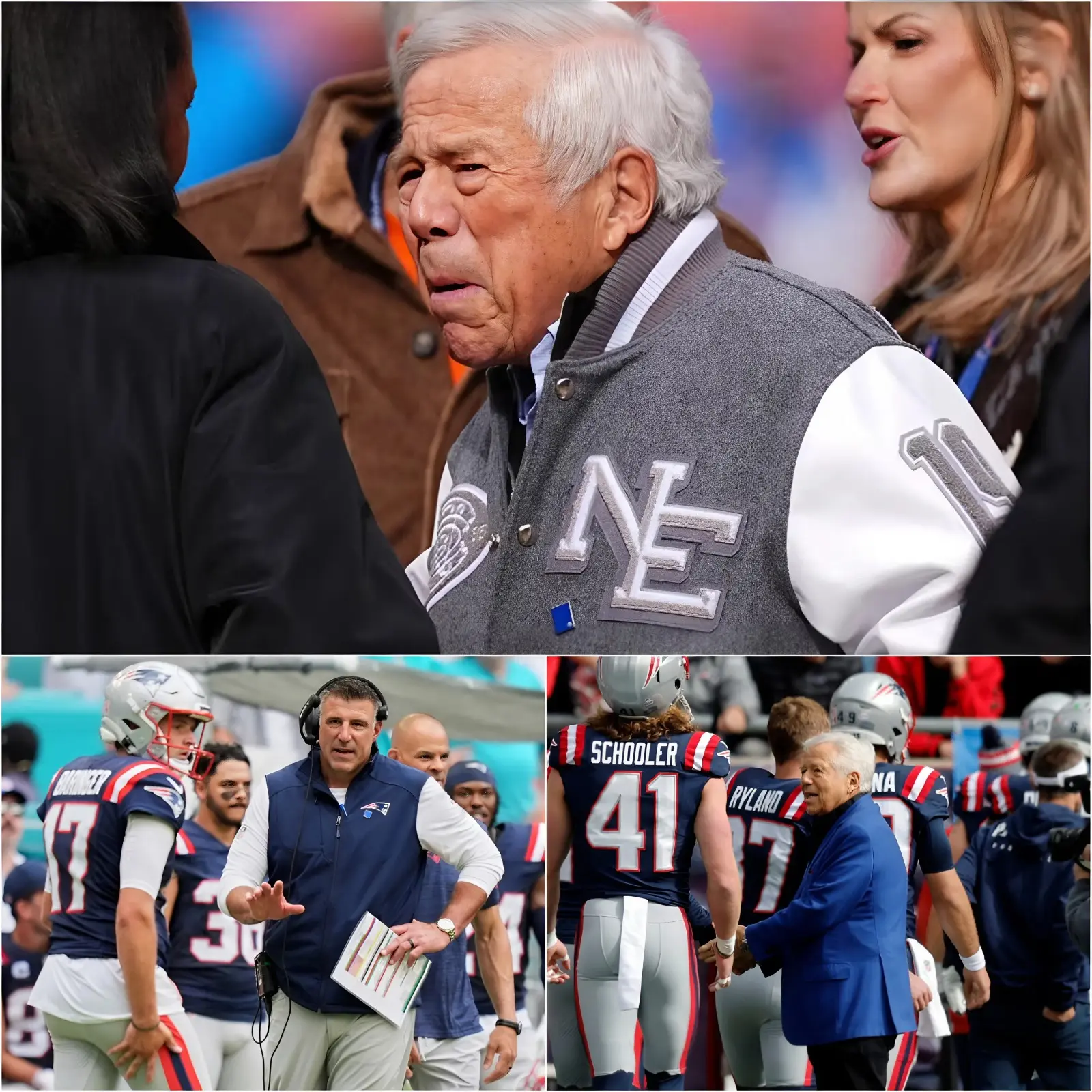 The breaking point came late in the third quarter. According to multiple eyewitnesses inside the organization, Kraft stormed down to the team area and confronted Mike Vrabel directly. In a moment described as “unfiltered” and “shocking even by NFL standards,” Kraft allegedly shouted, “Get that useless guy off the field immediately,” before demanding that three underperforming players be removed from the game on the spot. But the order did not stop there. Kraft went further, insisting that the players be expelled from the New England Patriots entirely.