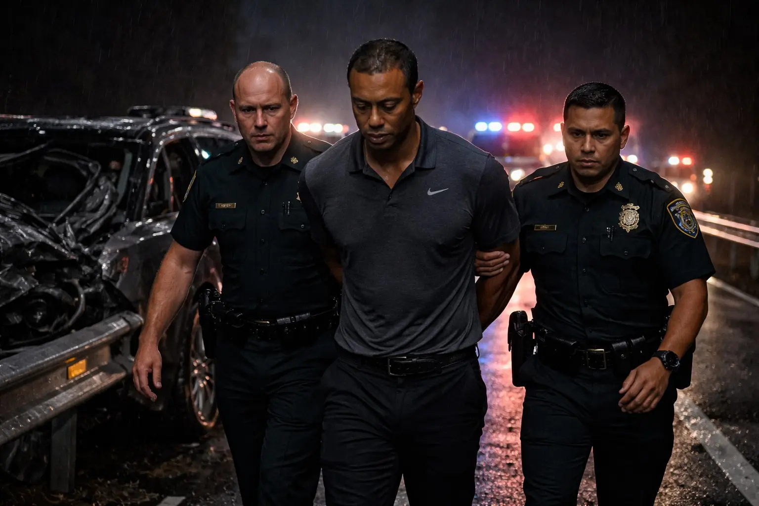 The scene at the crash site was dramatic and somber, as Tiger Woods, wearing a dark polo shirt and slacks, appeared disheveled and visibly distressed while being escorted by two uniformed Florida police officers. The officers, whose stern expressions conveyed the gravity of the situation, placed Woods in handcuffs as they guided him away from the wreckage of his vehicle. The heavily damaged SUV, which had clearly crashed into a guardrail, was surrounded by emergency vehicles with flashing red and blue lights. The mood was tense and somber as rain lightly fell, adding to the already heavy atmosphere.