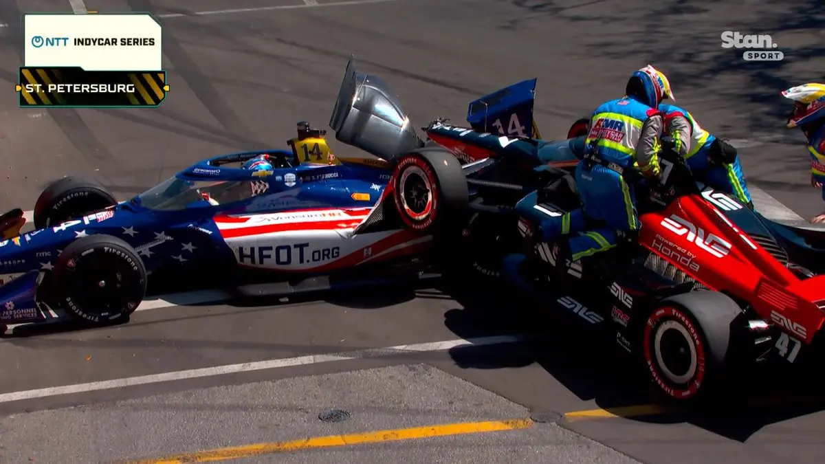 The crash unfolded in Turn 4 during the first lap of the race. Juncos Hollinger Racing’s Sting Ray Robb, driving a Chevrolet, braked late into the corner, leading to contact with AJ Foyt Racing’s Santino Ferrucci. Robb’s aggressive braking prevented Ferrucci from making a clean turn, causing both cars to slam nose-first into the tire barriers. Schumacher, positioned on the outside in his No. 47 Honda, had no room to maneuver and collided with the wreckage.