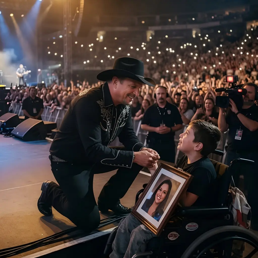 It happened during one of Garth Brooks’ massive stadium tours, a show known for its high-energy anthems, emotional ballads, and the superstar’s legendary ability to make every fan feel seen. But on this particular evening, Garth’s attention was drawn not to the screaming thousands, but to one small figure near the front of the stage: a young boy in a wheelchair, no older than ten or eleven, clutching a framed photograph tightly against his chest.