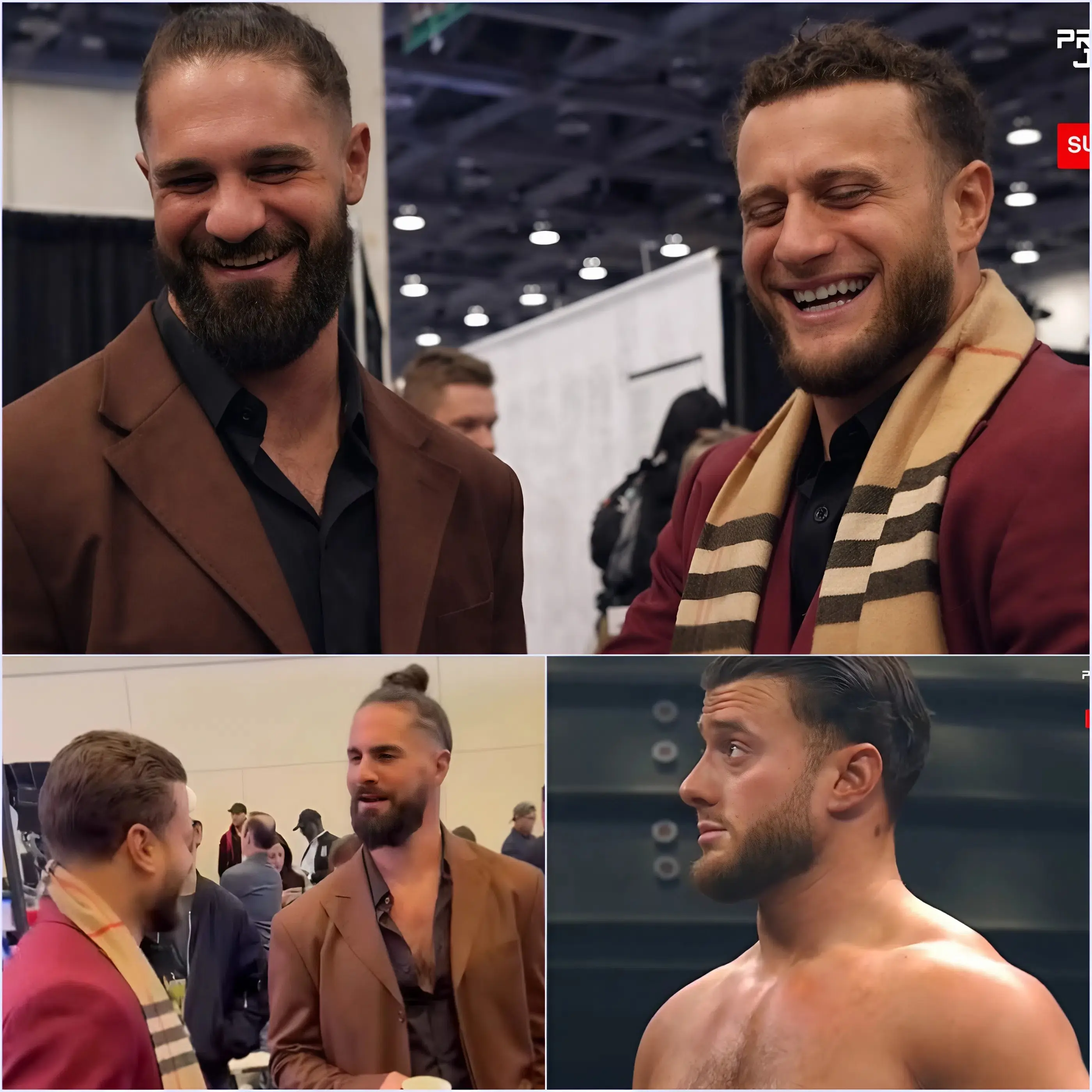 Eyewitnesses at the event described a moment that felt almost surreal to longtime wrestling fans. MJF, AEW’s notoriously arrogant and venom-tongued villain, was seen laughing openly, chatting casually, and even posing for friendly photos alongside Seth Rollins, WWE’s flamboyant and intensely competitive megastar. For audiences accustomed to MJF’s ruthless disdain for peers and Rollins’ larger-than-life intensity, the scene was jarringly human. Phones came out, videos circulated within minutes, and the internet did what it does best—explode with speculation, memes, and heated debate.