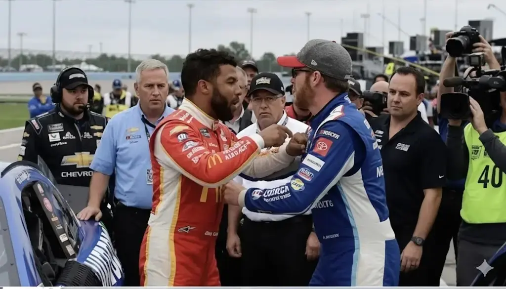 The NASCAR world was thrown into confusion this week after viral posts claimed that Bubba Wallace had received a long suspension and record-breaking fine following an on-track confrontation with Dale Earnhardt Jr.. The dramatic story spread rapidly across social media, complete with sensational captions and alleged quotes, leaving millions of fans stunned. But as the dust settled, a very different picture emerged, one that highlights how quickly misinformation can spiral in modern motorsport.