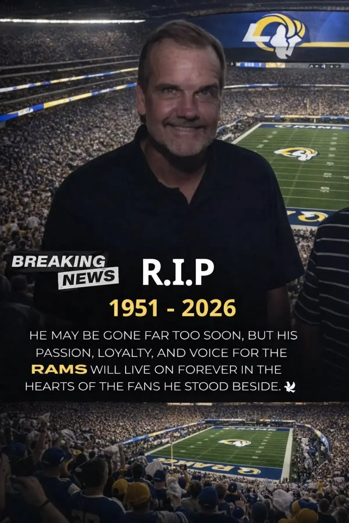 SAD NEWS 💔 The Los Angeles Rams community mourns the untimely loss of a loyal voice. The Los Angeles Rams community is grieving the tragic passing of a longtime Rams analyst, who devoted more than a decade to passionately supporting and defending the team he loved. He passed away at the age of 74 following a heartbreaking accident while returning home after what would become his final commentary in support of Los Angeles. Gone too soon, but his legacy lives on in the hearts of the community he stood for and defended with pride. Rest in peace.