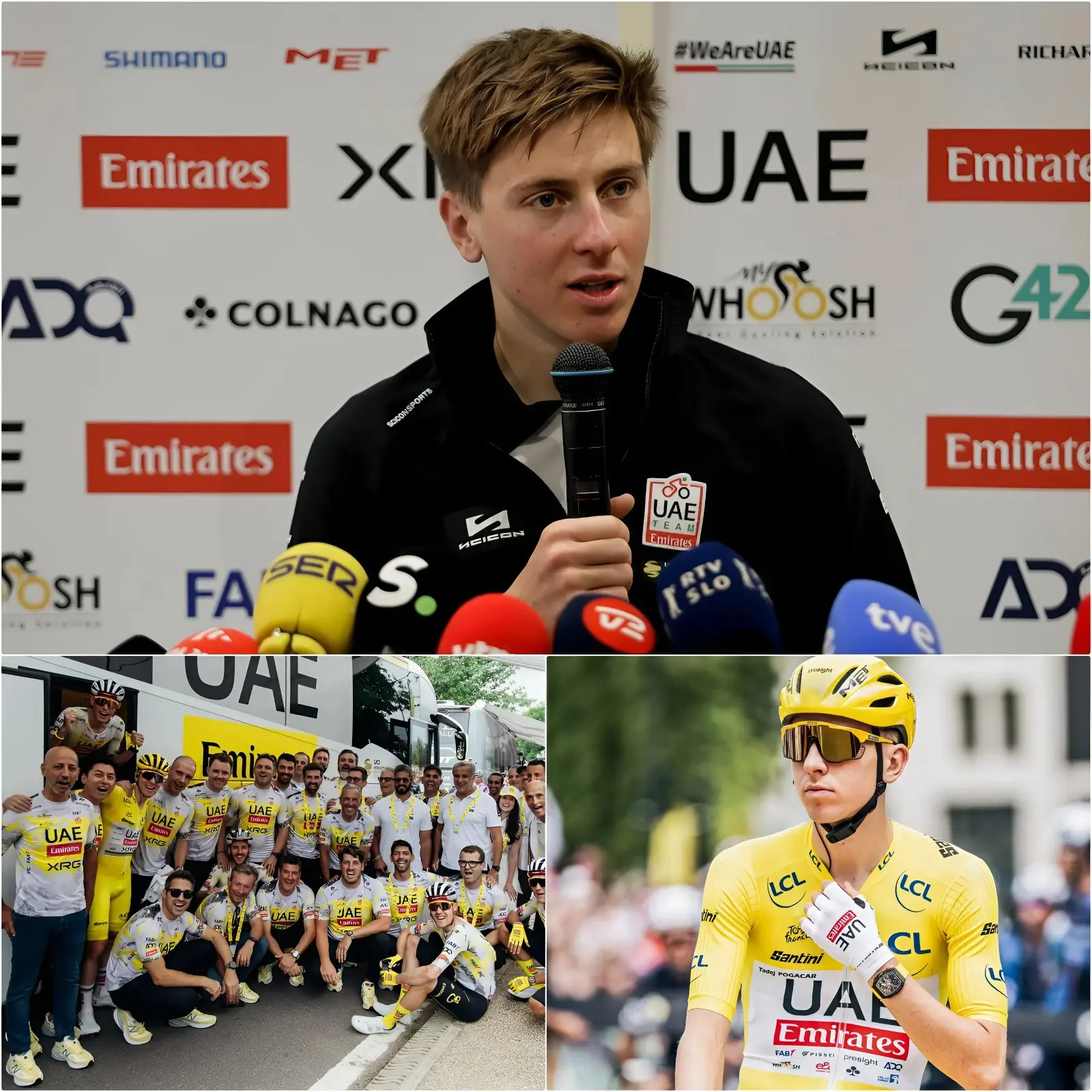Toen hij de zaal binnenkwam, viel meteen op dat er iets anders was dan anders. Zijn gebruikelijke rustige glimlach was verdwenen, vervangen door een gespannen uitdrukking, alsof hij een gevecht voerde dat niemand anders kon zien. De renners van UAE Team Emirates – XRG zaten verspreid achter in de zaal, fluisterend, nerveus. Niemand wist iets. Of tenminste, niemand wilde toegeven dat hij iets wist.