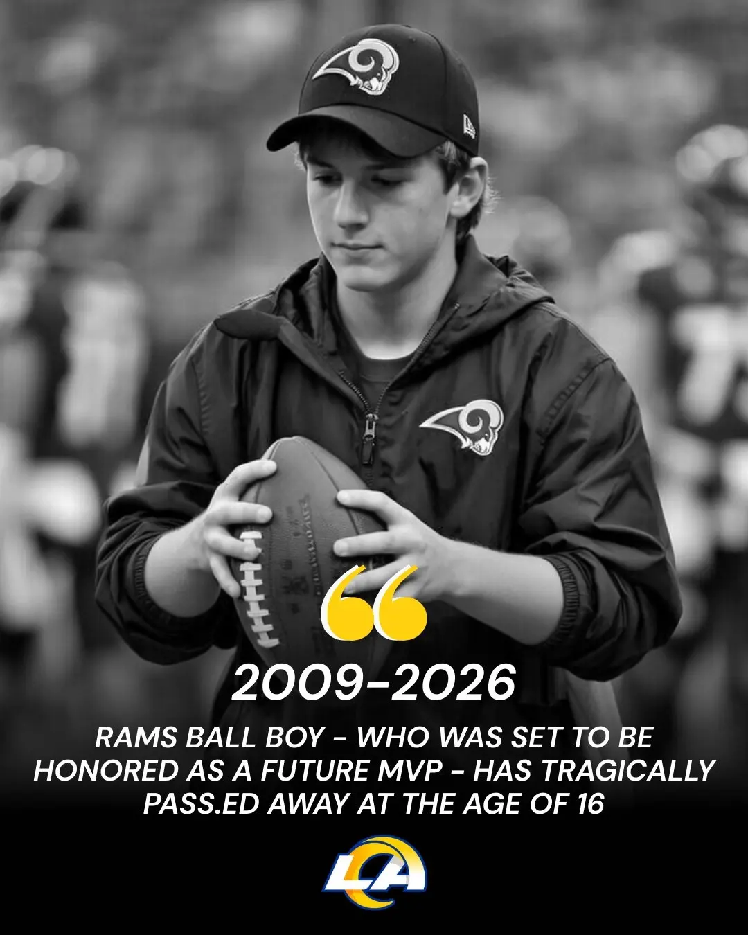 The Los Angeles Rams family is mourning the devastating loss of a 16-year-old whose presence had become woven into the fabric of the team’s wider community. For many, he was not just another fan in the stands or a name on a youth roster, but a familiar face whose enthusiasm for football and genuine kindness left a lasting impression on everyone who crossed his path. News of his passing has sent a wave of grief through Southern California and beyond, uniting players, coaches, fans, and local youth programs in shared sorrow.