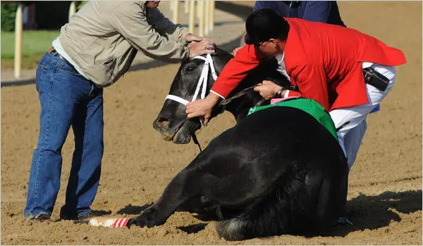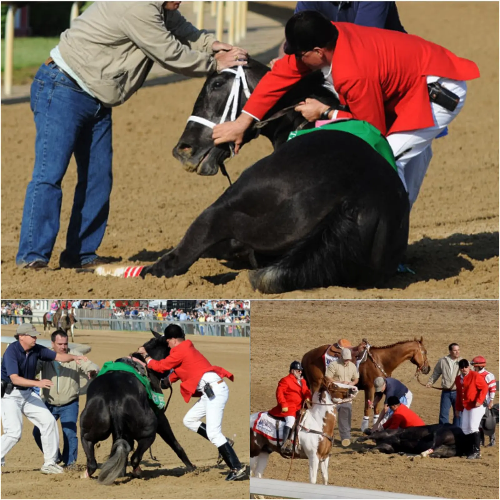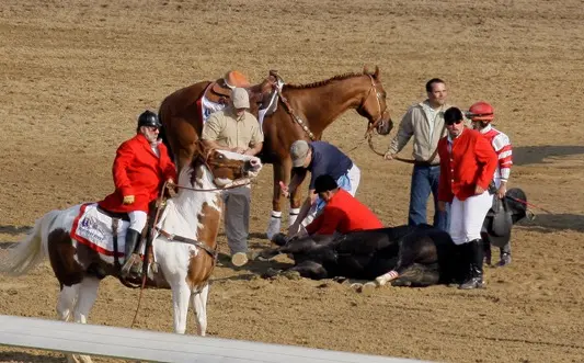 As Eight Belles began to pull up after crossing the finish line and galloped toward the clubhouse turn, her front legs suddenly gave way. Both cannon bones and sesamoid bones in her lower forelegs fractured in catastrophic compound breaks. The elegant gray filly, who moments earlier had looked invincible, collapsed onto the dirt track in full view of the television cameras. Millions watching at home witnessed the horror unfold in real time—no replay, no editing, no buffer. Saez, who had felt something amiss immediately after the wire, jumped from the saddle and knelt beside his mount. Track veterinarians, including Dr.